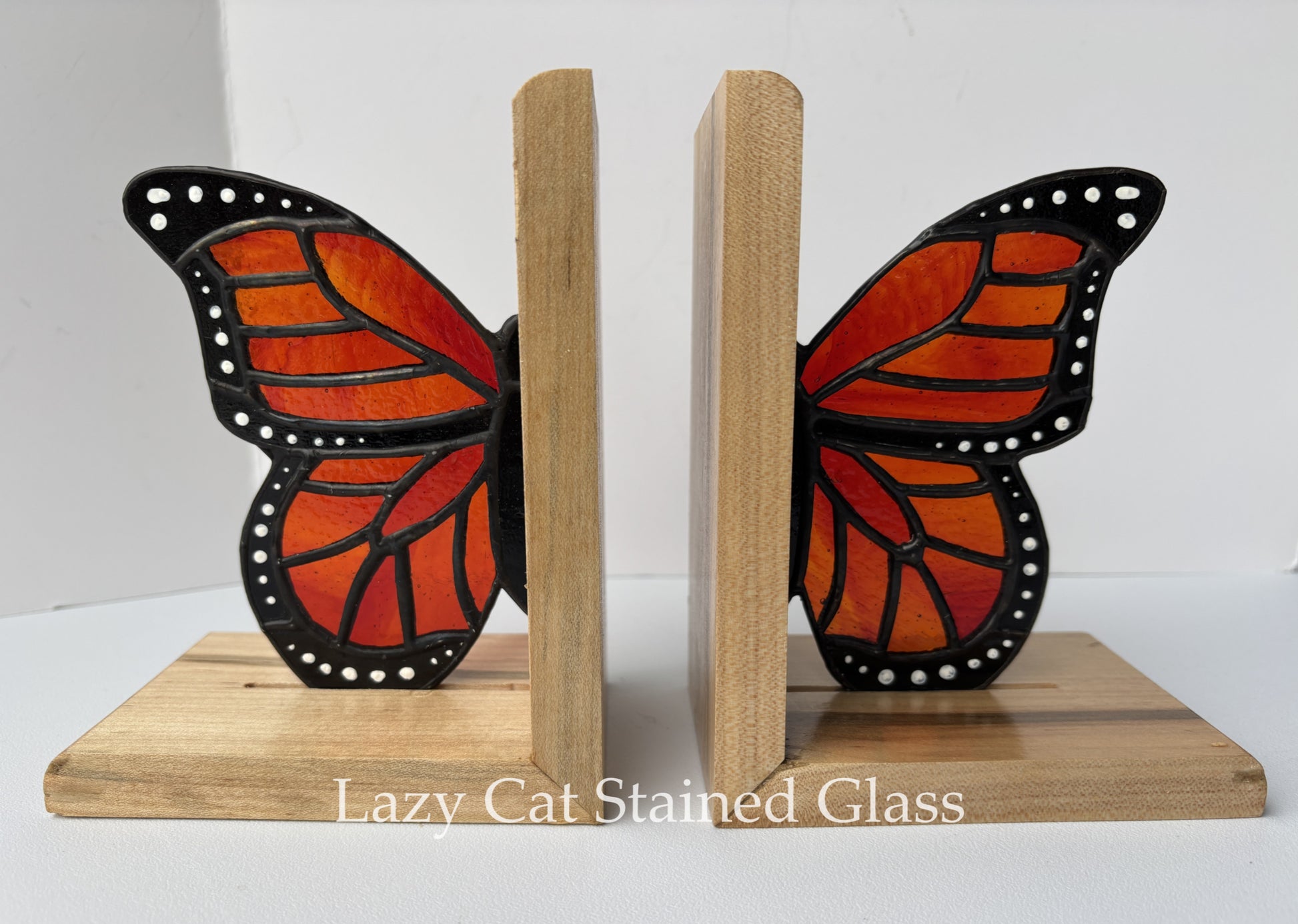 This pair of bookends features vibrant stained glass monarch wings mounted on natural wood bases. Each wing is handcrafted with rich orange, red, and black glass, with hand-painted white dots. When placed together, they form a full butterfly—equal parts functional and decorative.